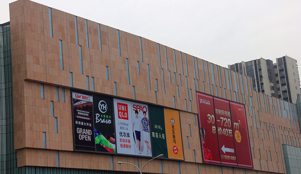 Sitting on the Chengdu Center and new centers of shuangnan longhu • Jin Nan Street, with its unique Canyon style commercial Street, layers of back of desktop design, people really go up, lock their purchasing power. Wall outside the commercial application only MT35, MT 36 products of 20000 square, and curtain wall technology, reasonable structure of simple design, maximally meet the wall edges and close local design needs.